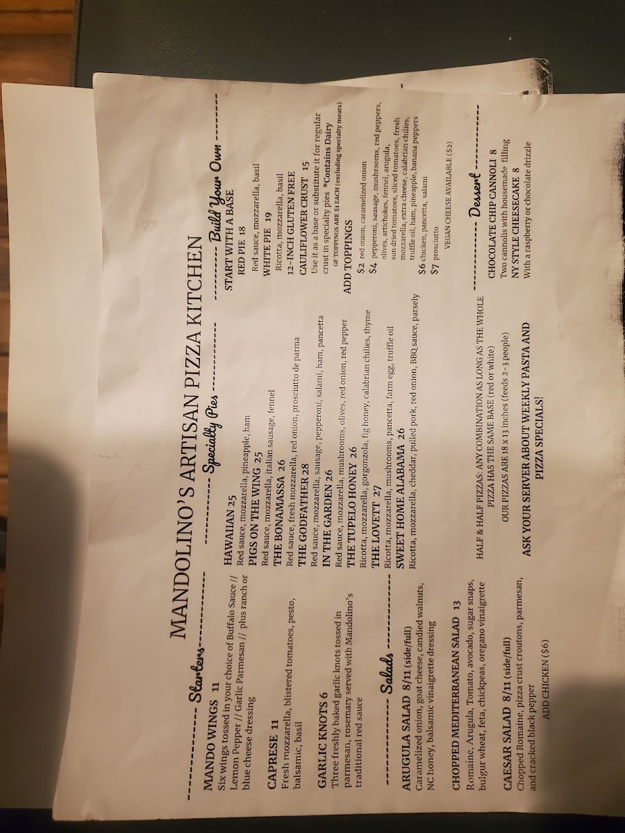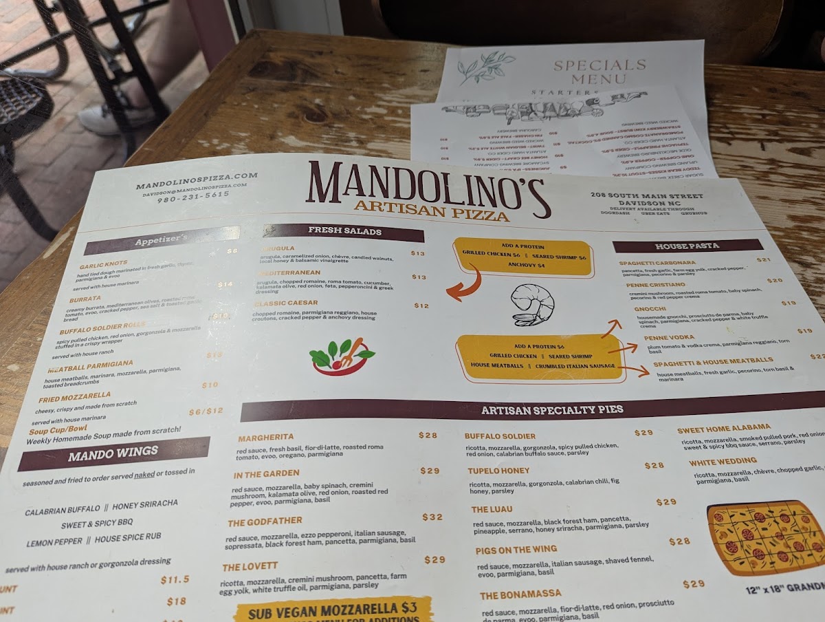 If you're craving a delightful pizza experience, look no further than Mandolino's Artisan Pizza Menu. Located in the heart of Davidson, NC, at 208 S Main St, this spot brings together fresh, high-quality ingredients to create pizzas that will leave you coming back for more. Whether you're in the mood for a classic Margherita or something a little more adventurous, Mandolino’s menu has something for everyone. Their artisan approach to pizza is evident in every bite, with a perfectly crispy crust, rich sauce, and a variety of toppings that range from savory meats to deliciously fresh vegetables. It's the kind of place where you can indulge in a comforting, flavorful meal with friends or family, and feel right at home. Plus, with such a welcoming atmosphere, it’s easy to see why this pizza spot has become a local favorite.